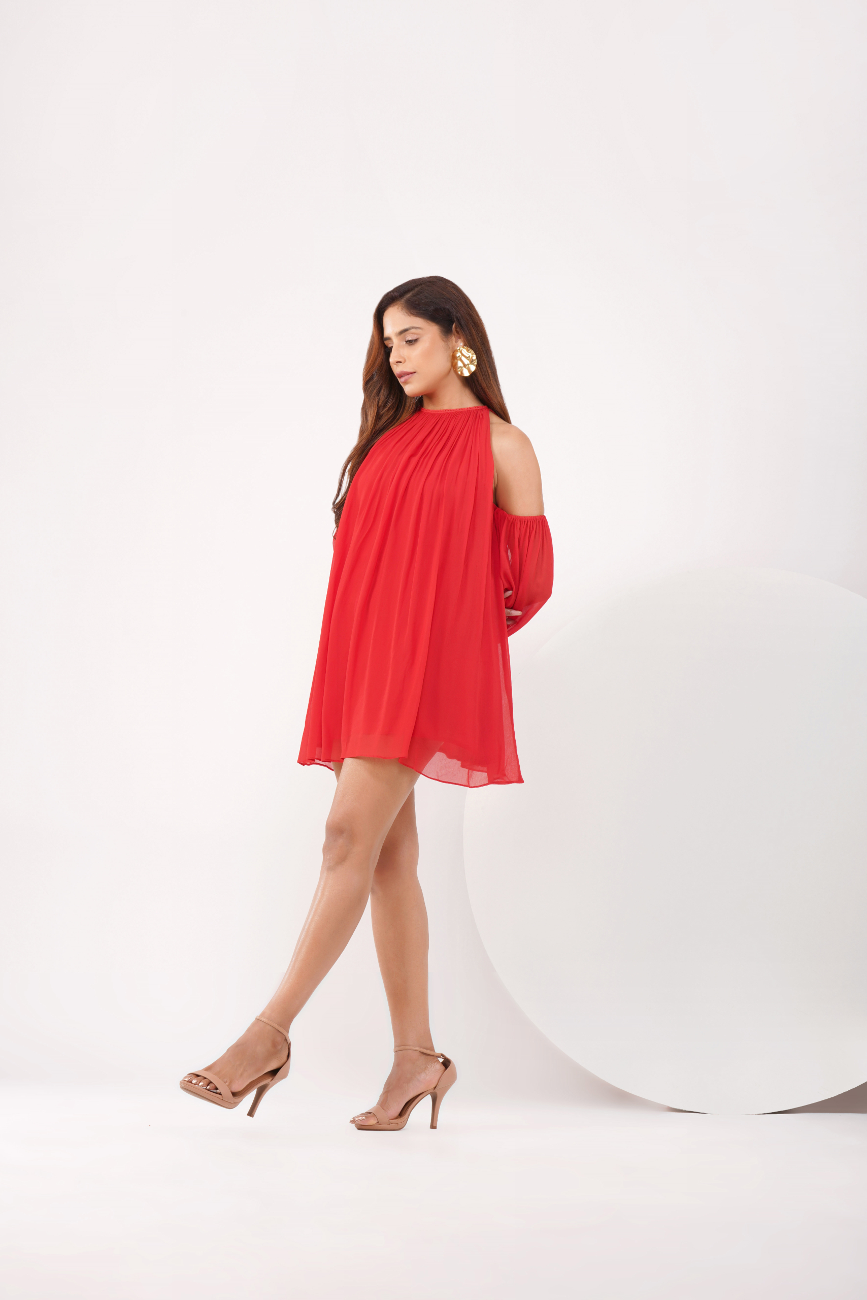 ₹4,200.00Cutout sleeves Gathered at neck Flared Crimson Red Lined Viscose Georgette DRY CLEAN Custom sizes are NOT ELIGIBLE for returns.