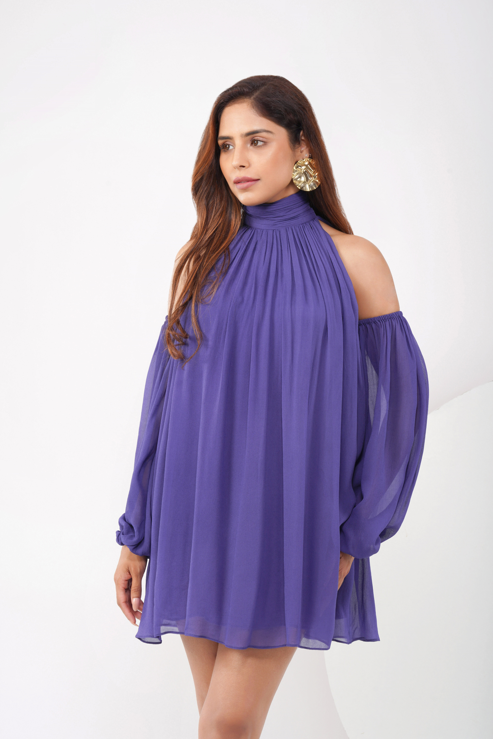 ₹4,200.00Cutout sleeves Gathered at neck Ties at the back Flared deep Blue-Purple Lined Viscose Georgette DRY CLEAN Custom sizes are NOT ELIGIBLE for returns.